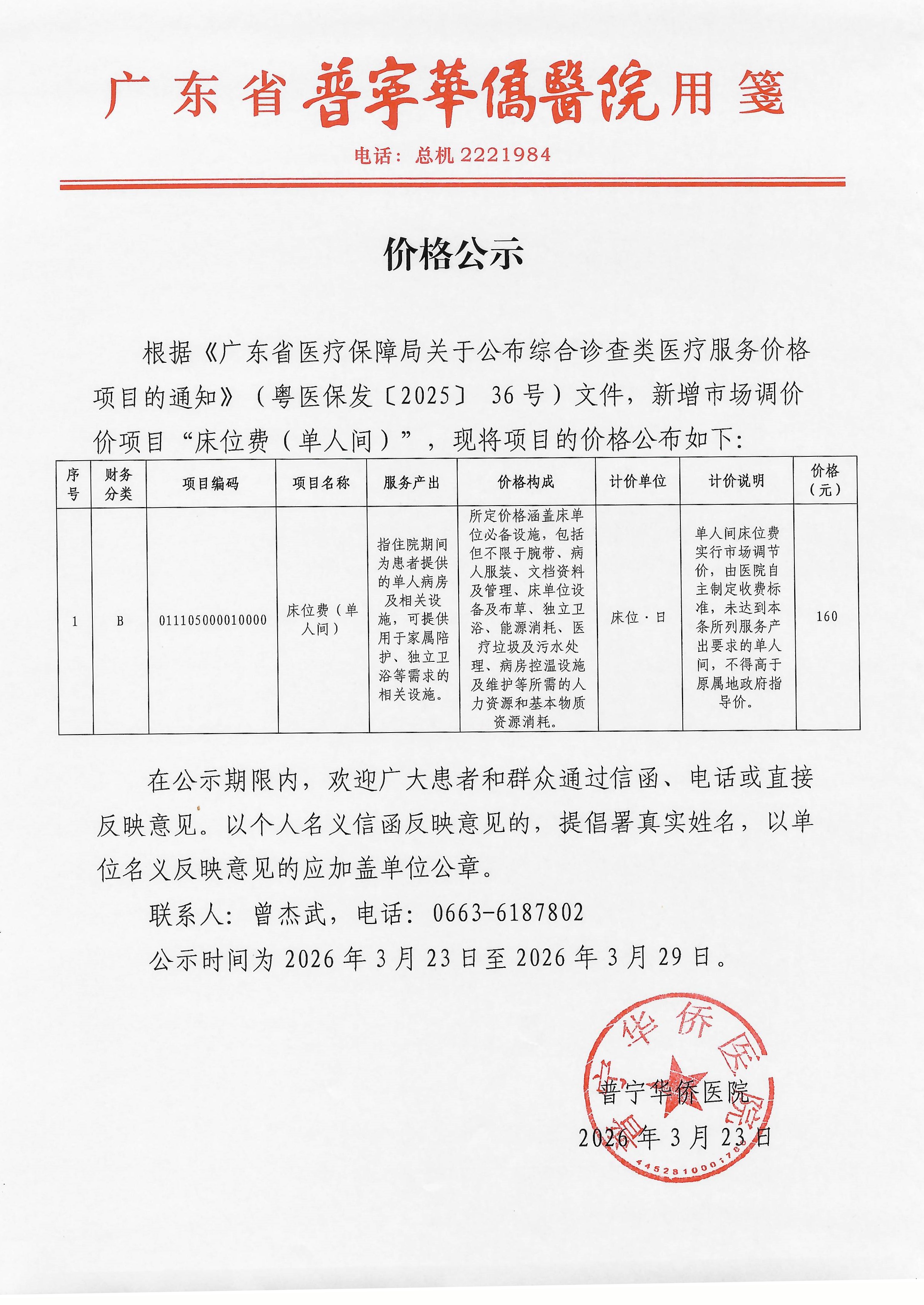 关于“床位费(单人间)”的价格公示